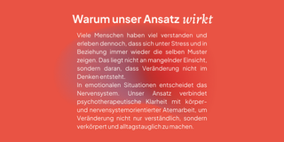 in der psychotherapeutischen Arbeit geht es um das Verstehen innerer Dynamiken, das Erkennen von Beziehungsmustern und die Einordnung psychischer Prozesse. Viele Menschen kommen mit viel Einsicht. Was oft fehlt, ist die leibliche Integration dieser Einsichten. Deshalb bleibt psychotherapeutische Arbeit bei uns nicht ausschließlich im Gespräch, sondern wird mit körperlicher Wahrnehmung und Regulation verbunden. Ziel ist nicht Optimierung oder Kontrolle, sondern Integration.